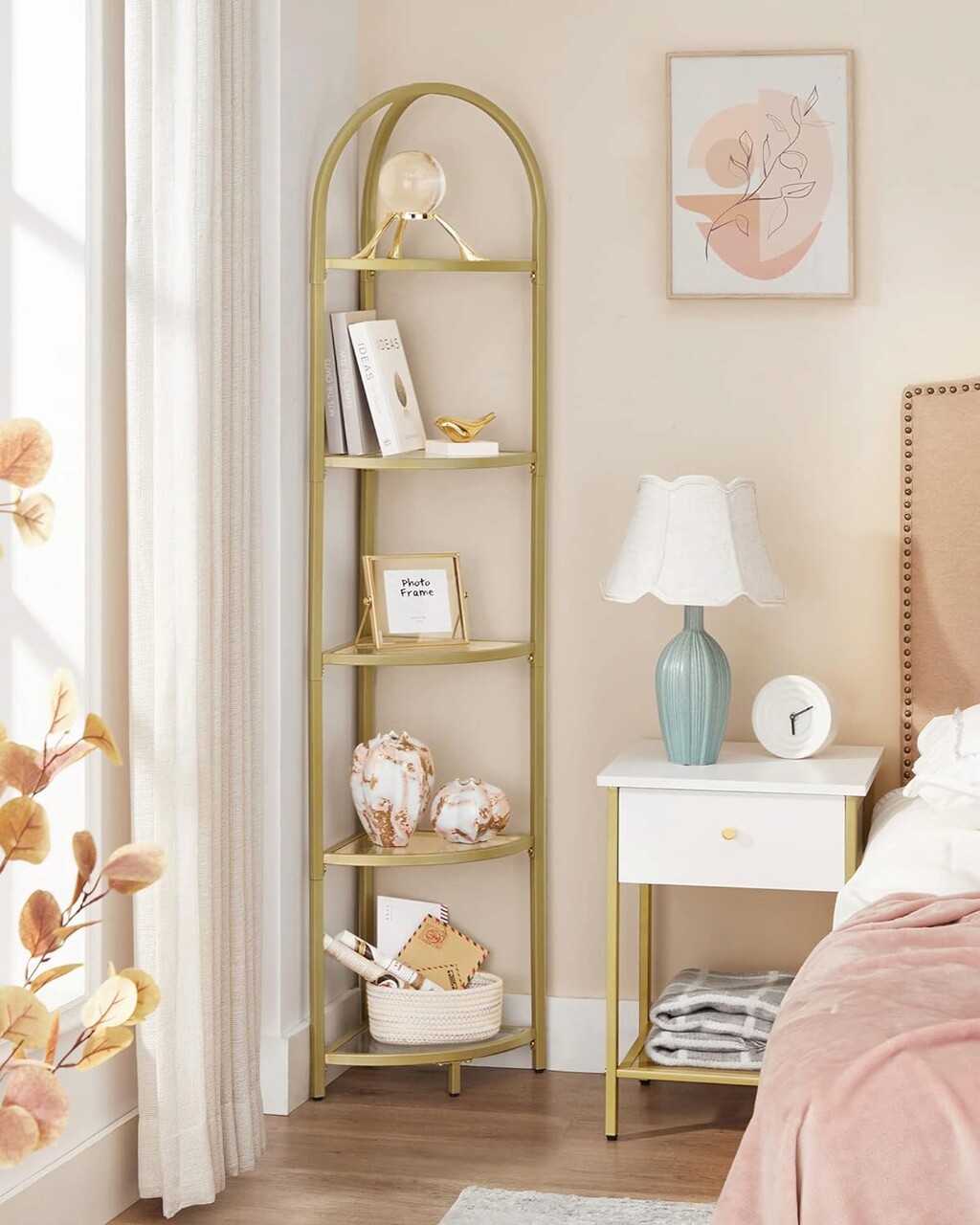 Egy csipetnyi csillogás - Ez a modern sarokpolc elegáns kialakításával, üvegpolcaival és aranykeretével egy csipetnyi csillogást kölcsönöz helyiségének.