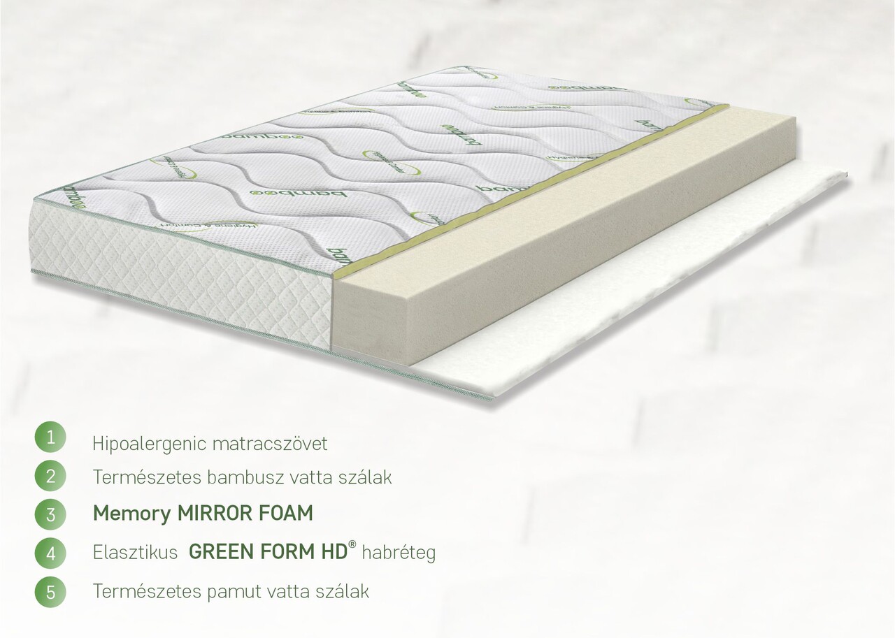 A Green Future által kifejlesztett allergia és ortopéd szakemberek együttesen a Bamboo Memory 140x200 cm matrac ötvözi a Green Form HD® rugalmas hab ortopédiai tulajdonságait a Thermal Green Thermal habszivacssal és a bambuszrostok természetes allergiaellenes tulajdonságaival.