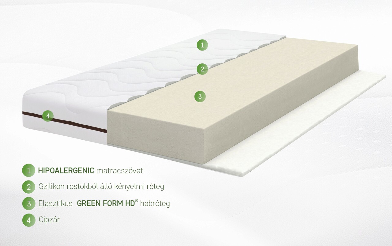 A Green Form HD elasztikus hab a matrac alapja szilikonszálakkal kombinálva biztosítja a test anatómiai támogatását és a gerinc megfelelő helyzetét alvás közben, hátfájás nélkül..