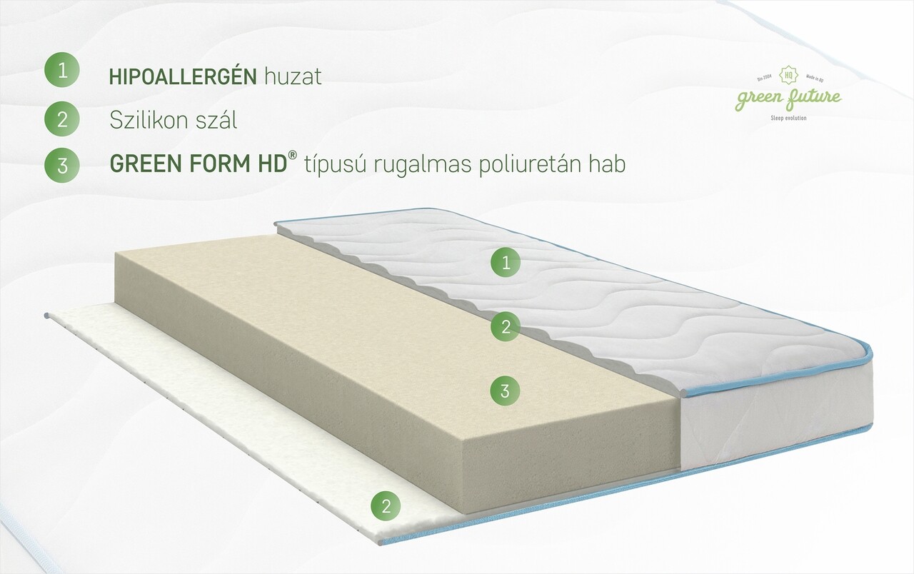 A matrac jó minőségű Oeko-Tex minősítésű anyagokból készült. A matrac belső szerkezete nagyvonalú, rugalmas, Green Form HD® habszivacsrétegből áll, nyitott cellulációval, amely biztosítja a test anatómiai alátámasztását és a gerinc helyes helyzetét, alvás közbeni hátfájás nélkül.