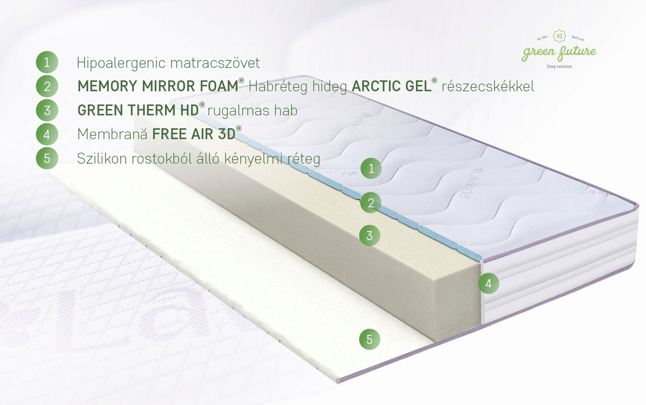 A matrachuzat puha anyagból készült és 2 cm-es Arctic Gel ® hűsítő részecskéket tartalmazó Green Therm Memory® habbal lett ellátva.A puha kényelmes réteg reagál a test hőjére, így az alvás alatt a nyomáspontokat kiküszöbölve pihenteti az izmokat és biztosítja a megfelelő vérkeringést.