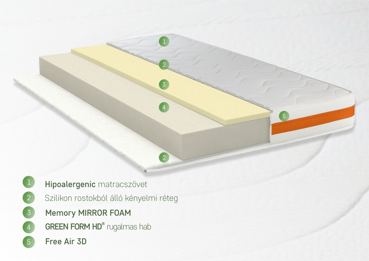 A matrac mindkét oldalon használható, különböző szilárdsággal. A memória rész kissé lágyabb. Azok, akik a szilárdabb matracot részesítik előnyben, használhatják a rugalmas haboldalt.