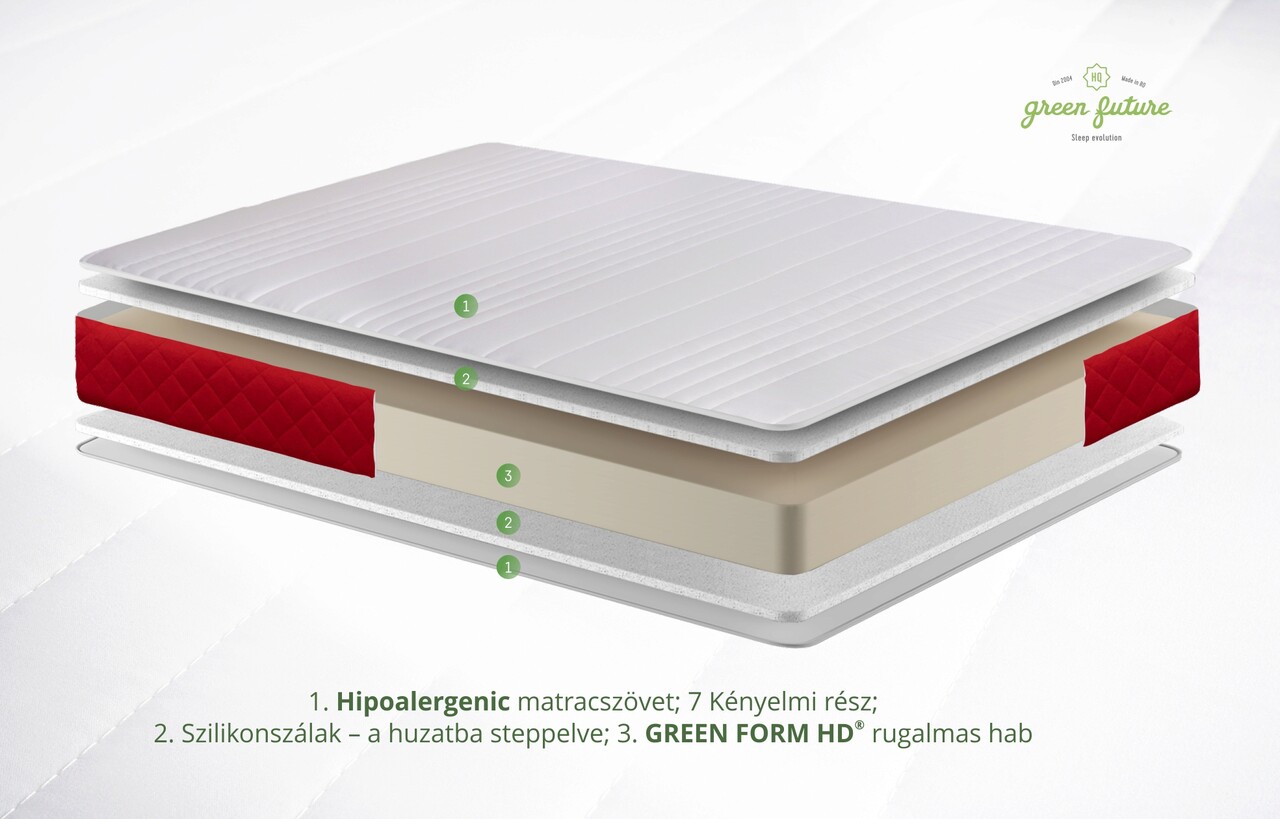 A matracot a legmagasabb minőségű anyagokból tervezték. A matrac Green Form HD® elasztikus habból készült, nyitott cellulózzal rendelkező alapanyaga biztosítja a test anatómiai alátámasztását és a gerinc helyes helyzetét hátfájás nélkül alvás közben.