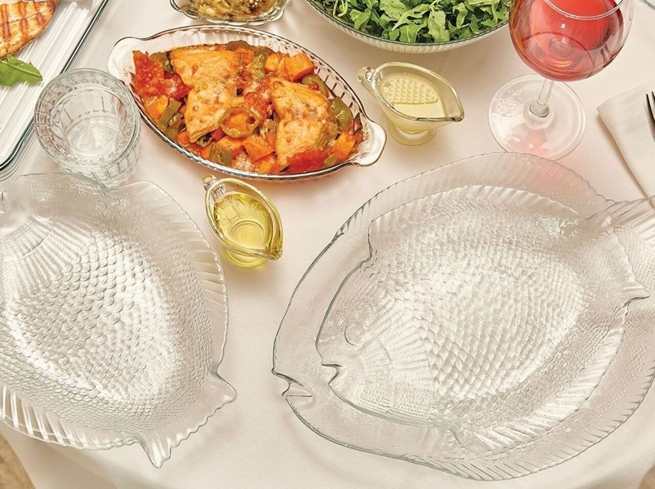Szervírozó tál temperált üvegből, elegáns hatást kelt, hal formájának köszönhetően. Könnyen tisztítható, elegáns és kifinomult formával rendelkezik. Mosogatógépben tisztítható, mikrohullámú sütőben használható.