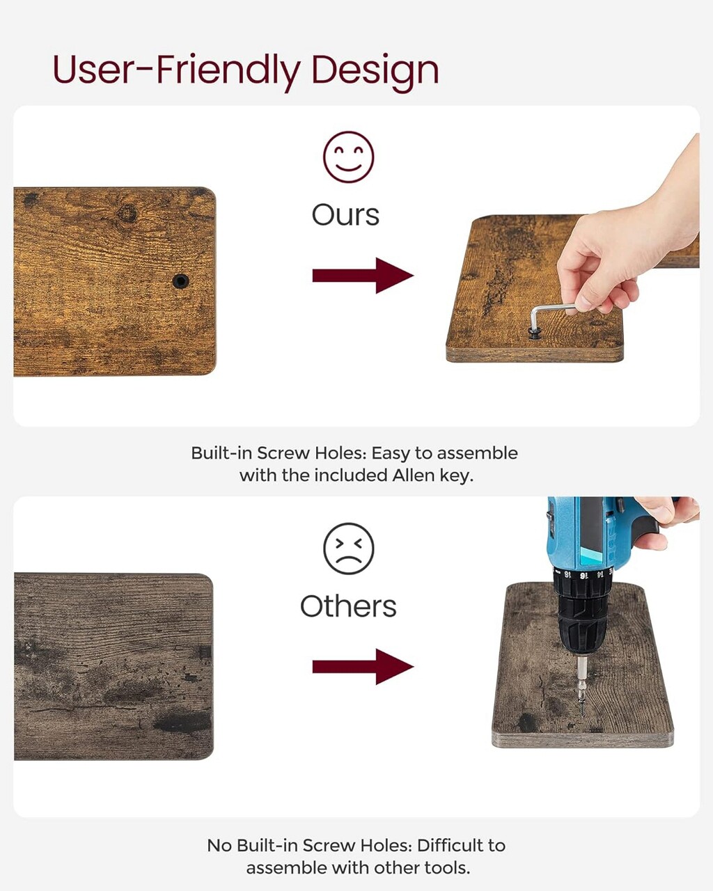 Könnyű összeszerelés - Világos útmutatót, megjelölt alkatrészeket és összeszerelő szerszámokat biztosítunk, ráadásul a panelek és a fémkeretek már előre össze vannak szerelve, így ezeket a fali polcokat pillanatok alatt felépítheti.