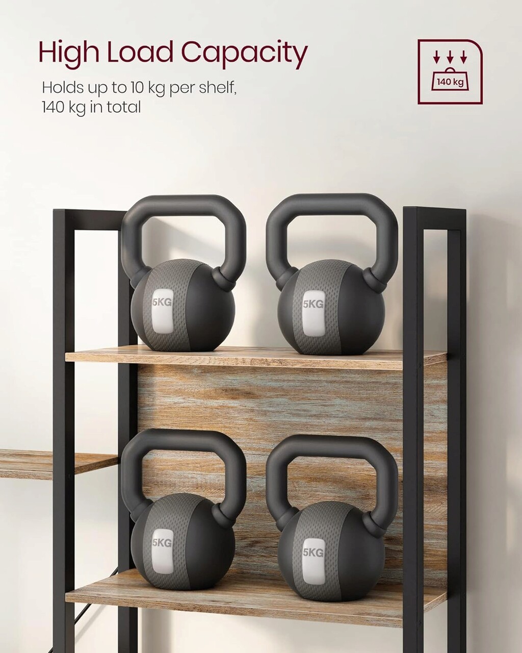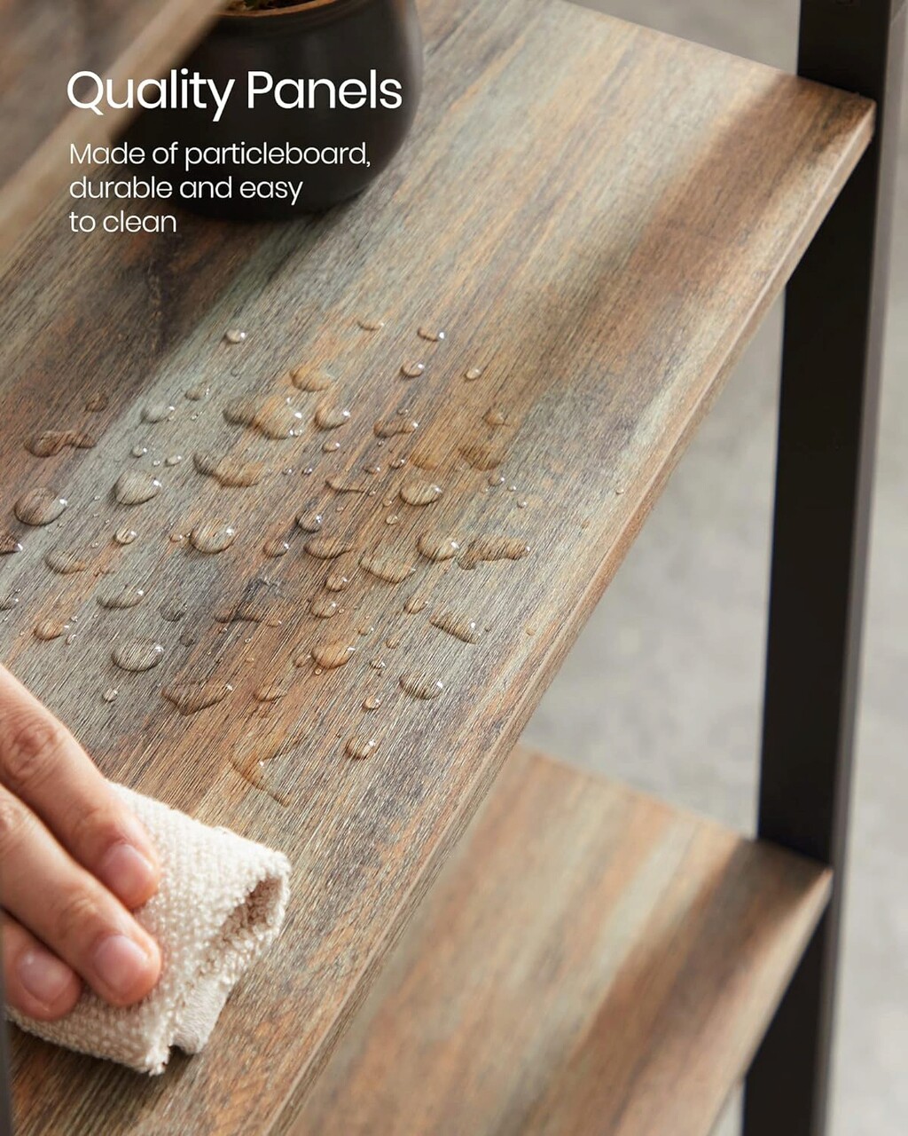 A rusztikus polcok fekete kerettel kombinálva bájos ipari megjelenést biztosítanak, amely biztosan feldobja bármelyik szoba stílusát, amelyben használja.