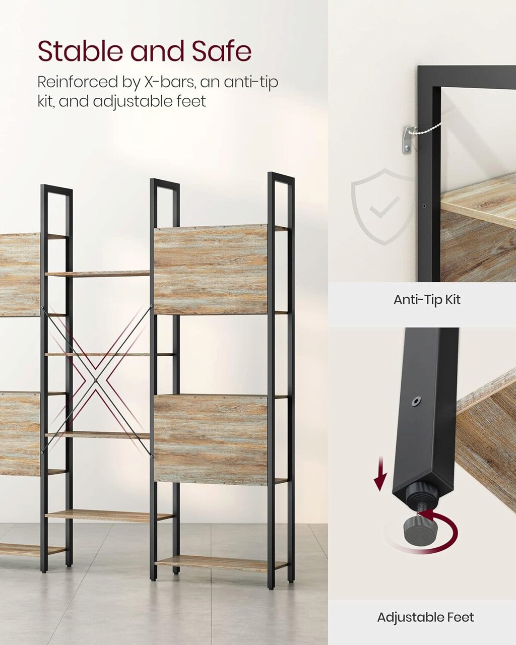 A minőségi acélból és forgácslapból készült masszív keret a hátlapokkal és az állítható lábakkal kombinálva stabil és stabil támasztékot ad könyveinek, dekorációinak vagy növényeinek.