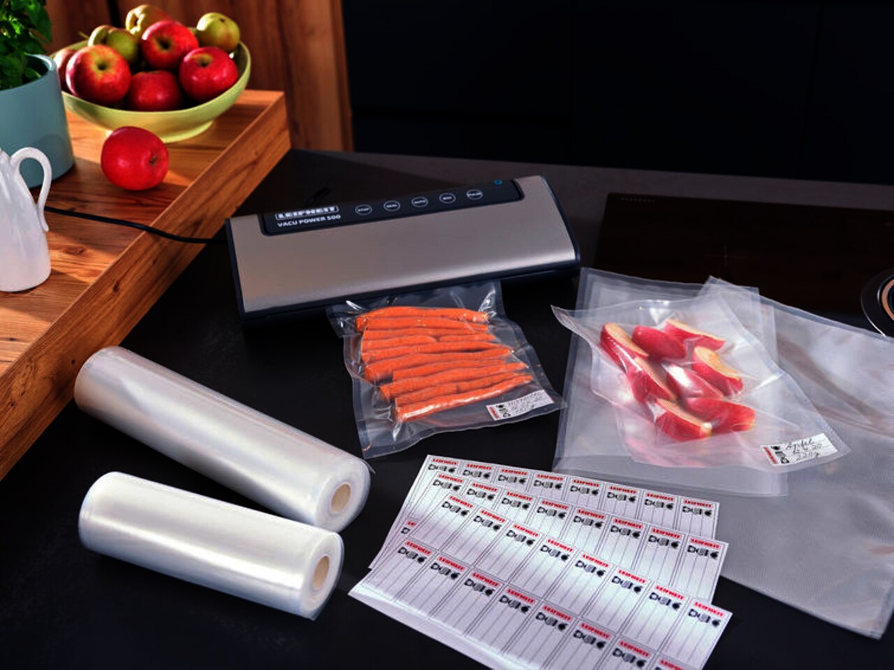Az 50 vákuumzsák mellett 56 címkét is tartalmaz. Így könnyedén felcímkézheti a zacskókat.
