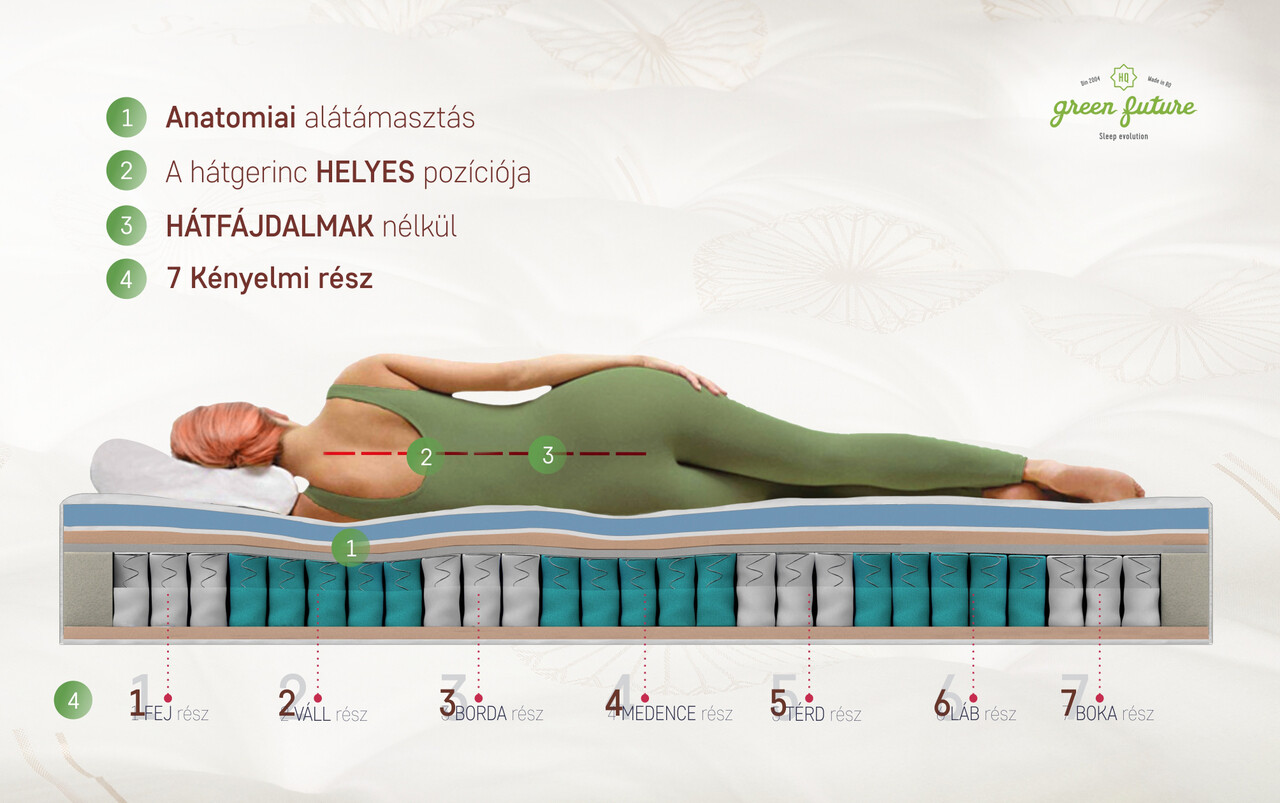 A rugók hét komfortzónába vannak csoportosítva a test és a gerinc megfelelő alátámasztása érdekében pihenés közben.