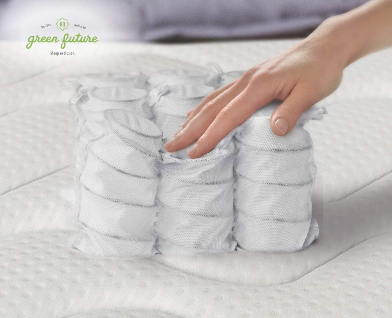 A rugók egyenként textil dobozokba vannak csomagolva, és egymástól függetlenül hatnak a rájuk gyakorolt nyomásra, ezáltal tökéletesen anatómiailag formázva a testet. A köztük lévő kapcsolatok nélkül nem kapcsolja be a többi rugót mozgásba, nagy stabilitást és nulla kényelmetlenséget kínálva az alvó partner számára. Ezenkívül a 7Z Green Pocket® rendszer lehetővé teszi a testrészek eltérő megtámasztását, attól függően, hogy milyen nyomást gyakorolnak rájuk a matrac felületén, hogy biztosítsák a gerinc csigolyáinak helyes és egészséges igazítását.