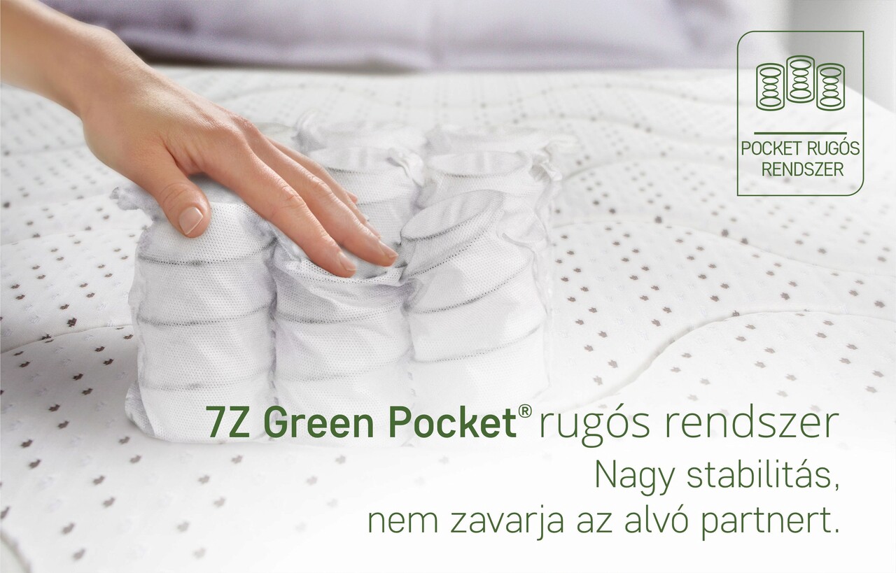 A rugók egyenként textil dobozokba vannak csomagolva, és egymástól függetlenül hatnak a rájuk gyakorolt nyomásra, ezáltal tökéletesen anatómiailag formázva a testet. A köztük lévő kapcsolatok nélkül nem kapcsolja be a többi rugót mozgásba, nagy stabilitást és nulla kényelmetlenséget kínálva az alvó partner számára. Ezenkívül a 7Z Green Pocket® rendszer lehetővé teszi a testrészek eltérő megtámasztását attól függően, hogy milyen nyomást gyakorolnak rájuk a matrac felületére, hogy biztosítsák a gerinc csigolyáinak helyes és egészséges összehangolását.