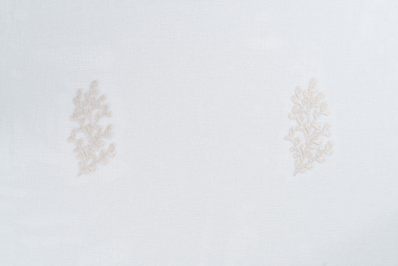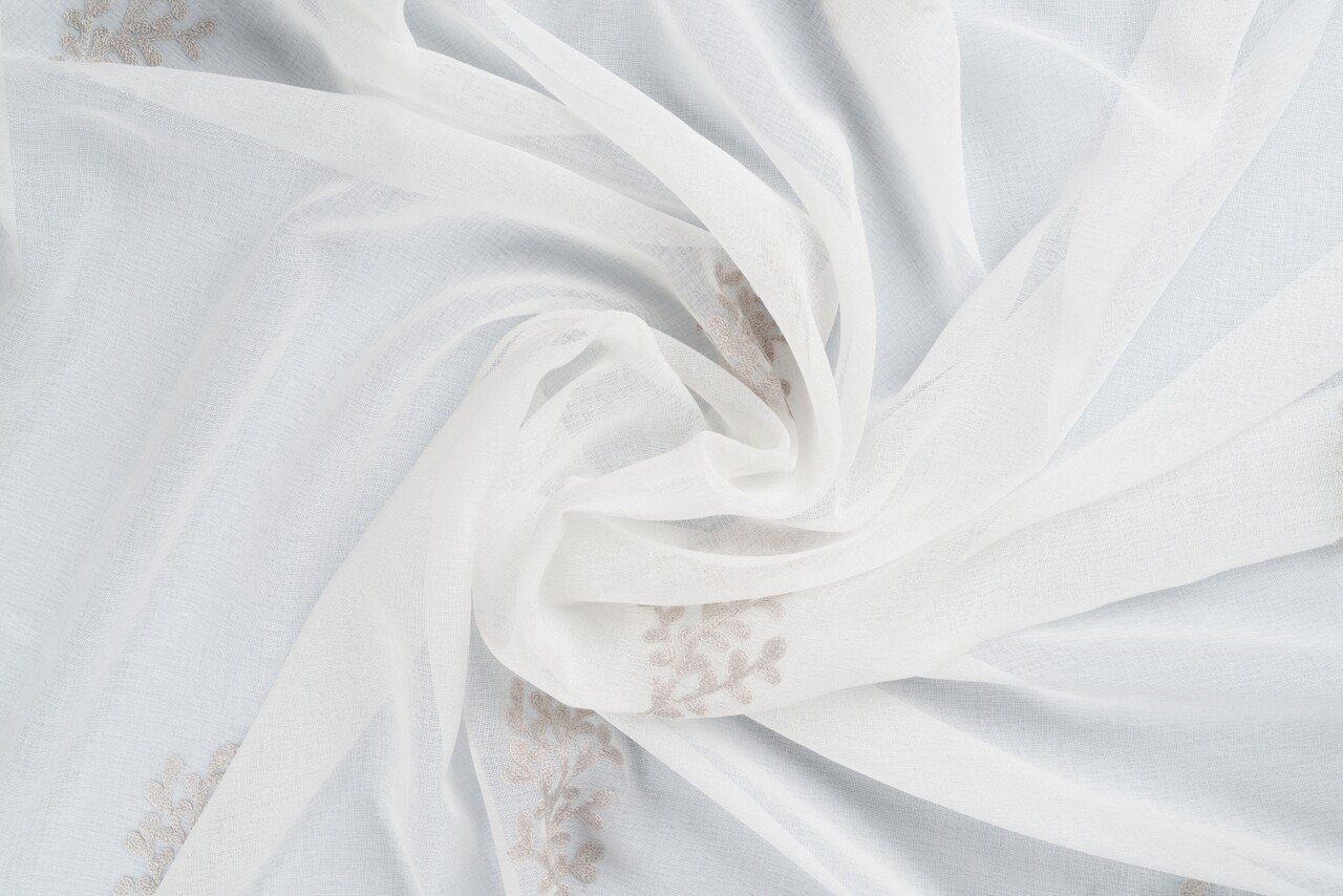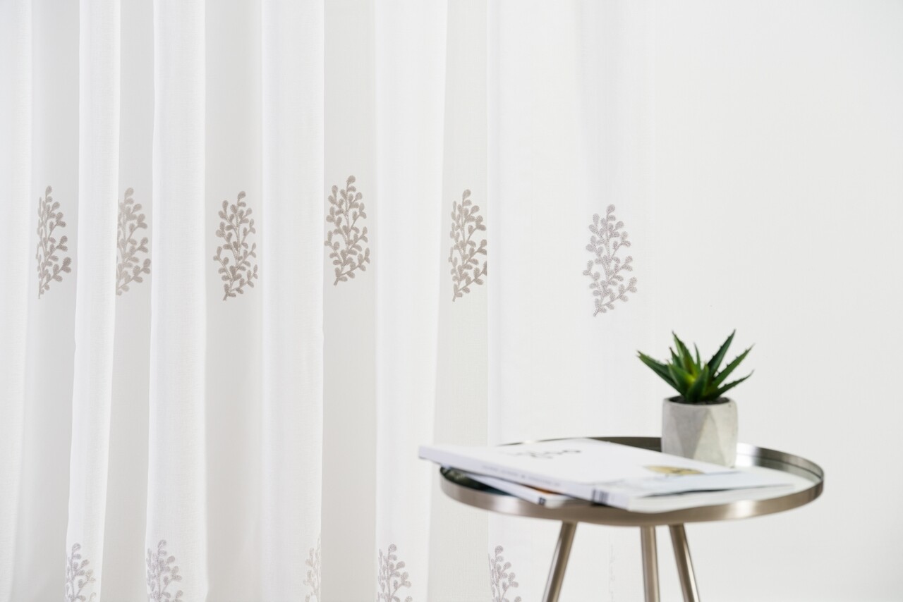 Egyszerű függöny szürke hímzett betétekkel, klasszikus stílusban, ideális a klasszikus dizájnhoz.