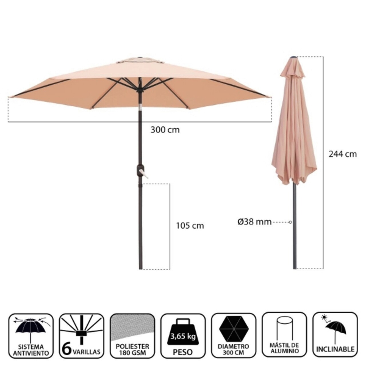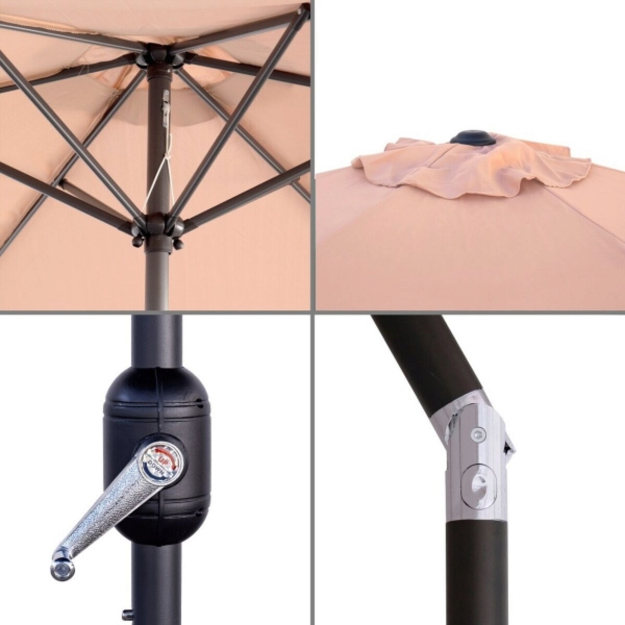 Monty Terasz/kerti napernyő, Ø 300 cm, Ø38 mm, szélelleni rendszer, billenő és kurblival, alumínium, bézs színű