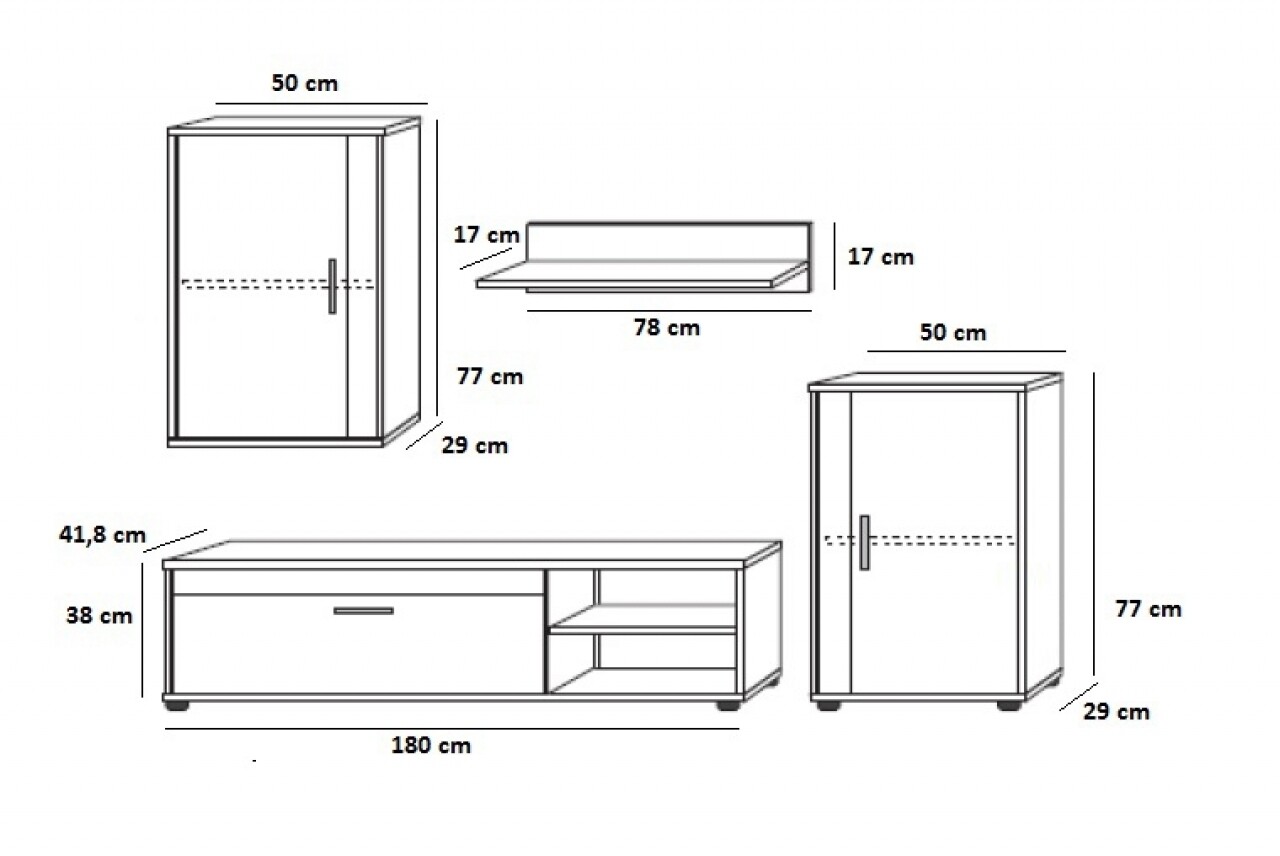 Nappali bútor Oslo V, Bedora, 1 x polc, 1 x komód, 1 x szekrény, 1 x függesztett szekrény