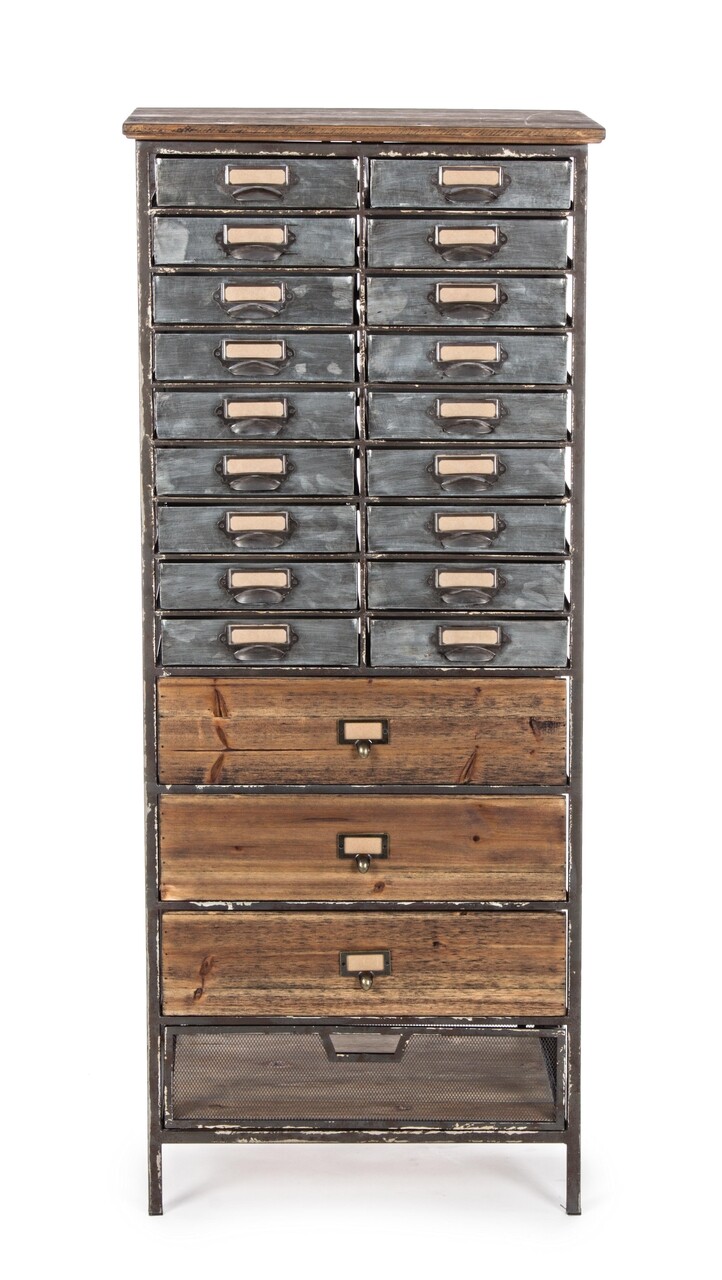 Acélváz, acél fiókok, fenyőfa és cink.