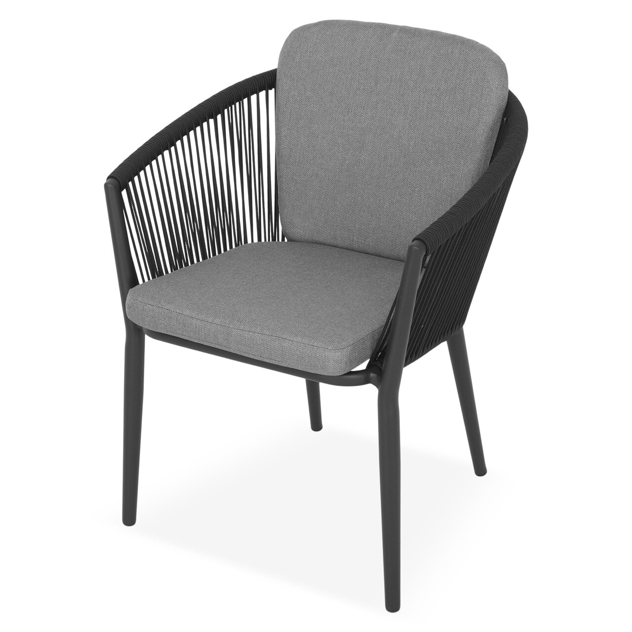A székek tömör alumíniumszerkezetű, elektrosztatikusan festett és UV-védett, kötelet imitáló textilszálakkal fonottak. Tartalmazza a párnákat, amelyek nedvesség- és UV-védelemmel ellátott Olefin szövetből készültek. Az asztal teljes egészében tömör alumíniumszerkezetből készült, elektrosztatikusan festett.