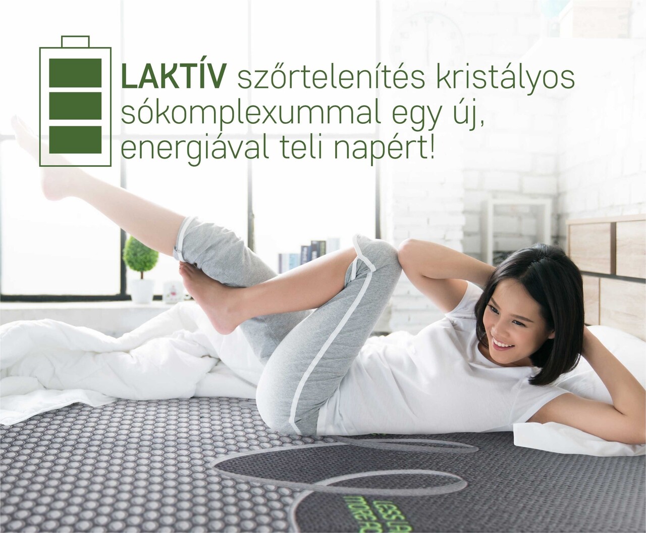 A matracszövetet LACTIVE® -val, kristályos sók komplexével kezelik, amely hasonlóan működik, mint az ózonterápia. A sók aktív ionokat bocsátanak ki a környezetbe, amelyeket belélegeznek, és növelik a vér oxigénszintjét. A hatás csökkenti a tejsavat és megszünteti a fáradtságot. A kiváló minőségű alvás helyreállítja a testi és lelki egyensúlyt egy új, energiákkal teli naphoz.