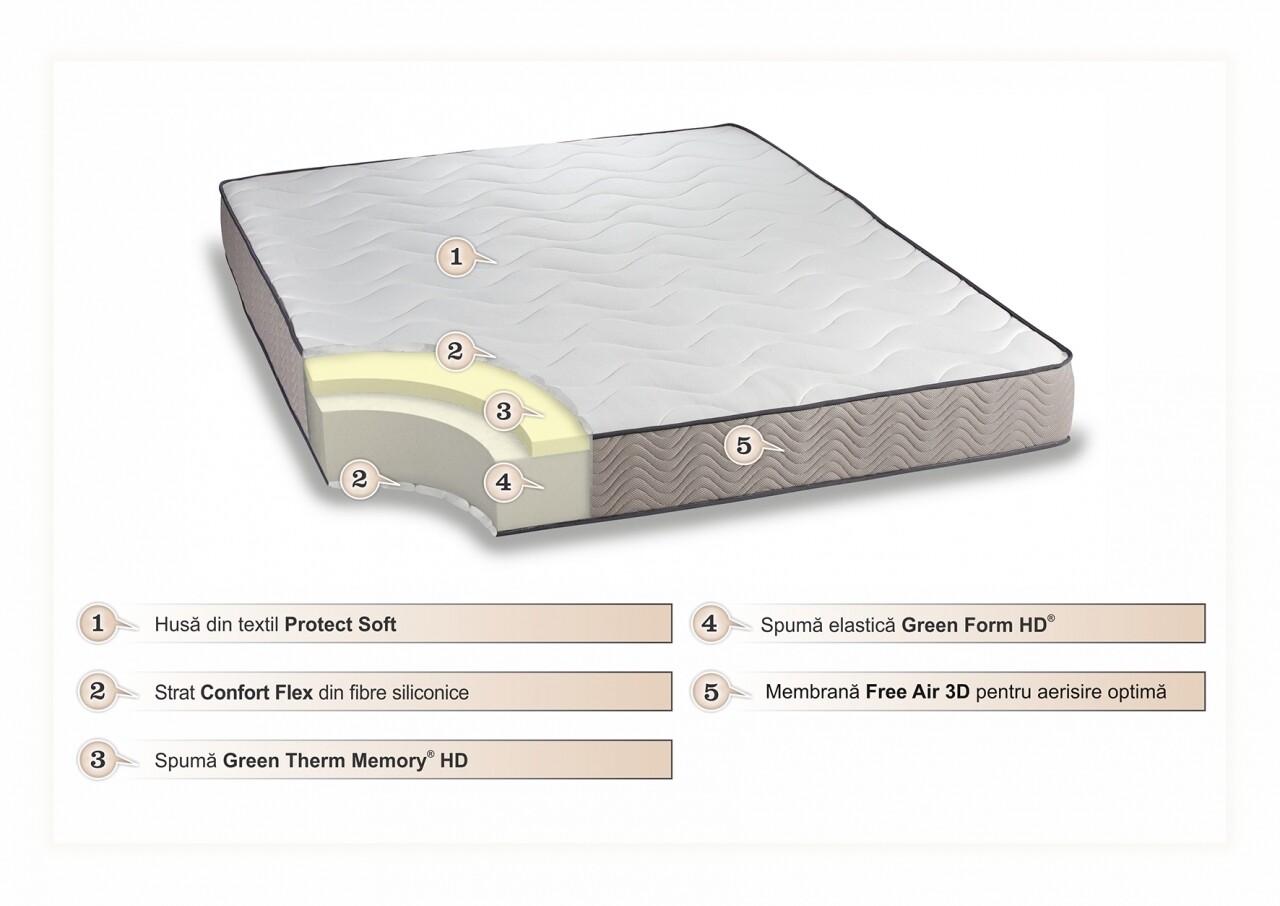 Stratul de 3 cm de spumă Memory reduce punctele de presiune în timpul somnului (umeri, șezut, picioare) și relaxează mușchii în timpul somnului.