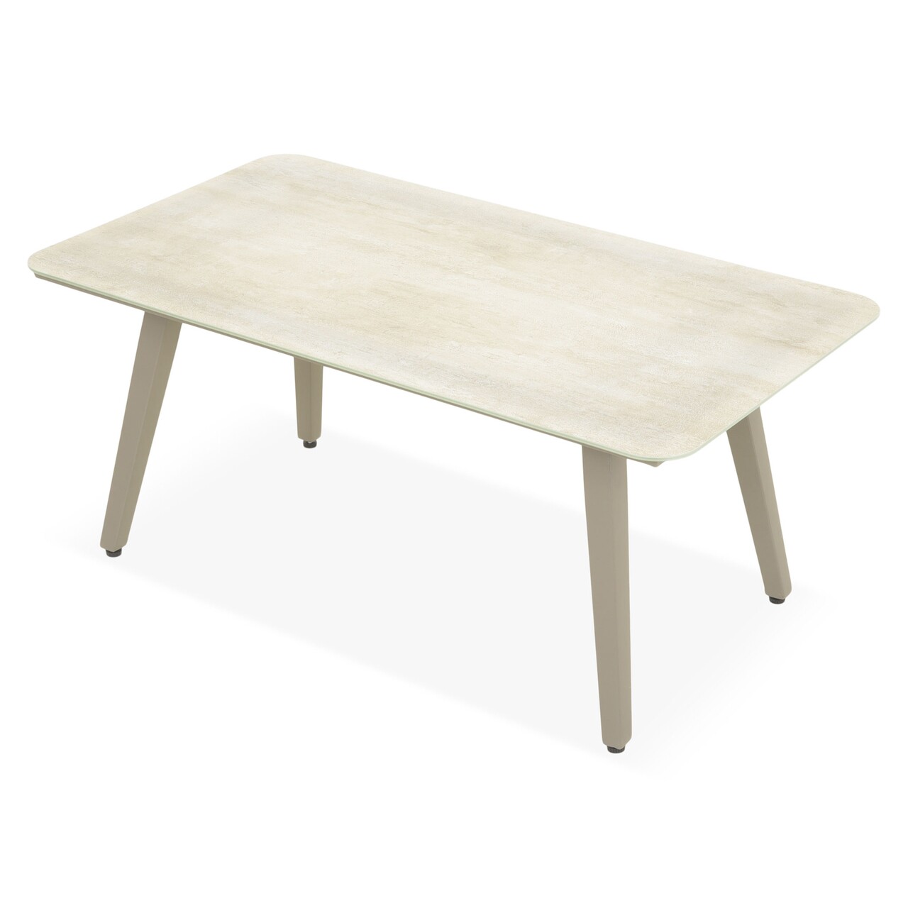 Elektrosztatikusan festett alumíniumszerkezetből készült, UV-védett kötelet imitáló textilszálakkal fonva. Tartalmazza a nedvesség és fakulás ellen védett poliészter párnákat. Az asztallap kerámiából készült.