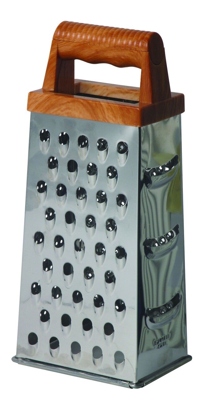 Horganyzott acél reszelő, nagyon praktikus mind a fogantyúnak, mind a biztos markolatnak, mind a 4 oldalnak köszönhetően, amelyek változatosságot kínálnak kedvenc ételeinek elkészítésében.