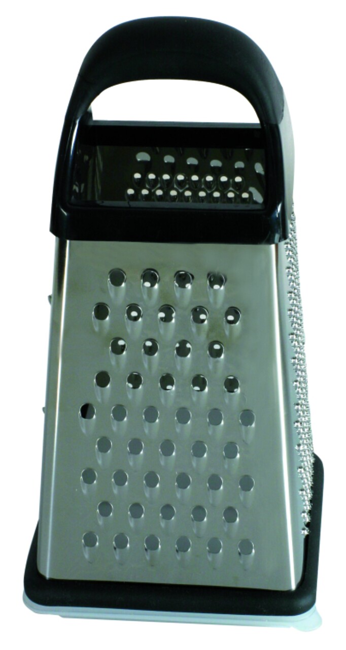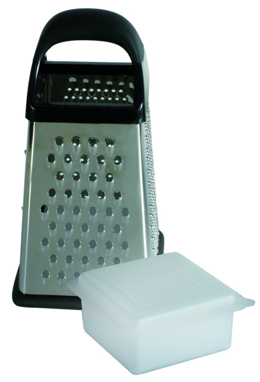 Rozsdamentes acél kaparók puha tapintású fogantyúval a biztonságos, csúszásmentes fogásért. Az alap is a használat közbeni stabilitás érdekében készült. A reszelő belsejében egy tárolóedény található, fedővel, melyben élelmiszerek tárolására is alkalmas, anélkül, hogy kiszáradna, ízét elveszítené. Négy oldala van, és minden konyhában nélkülözhetetlen kellék.