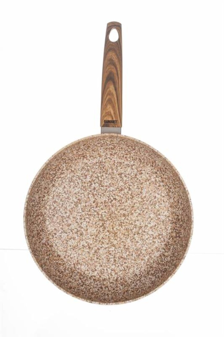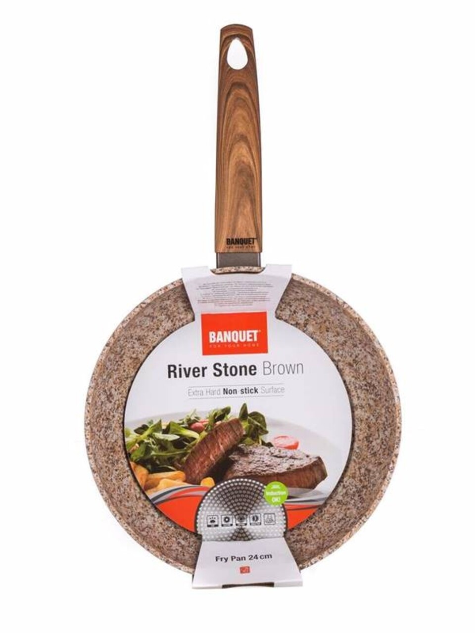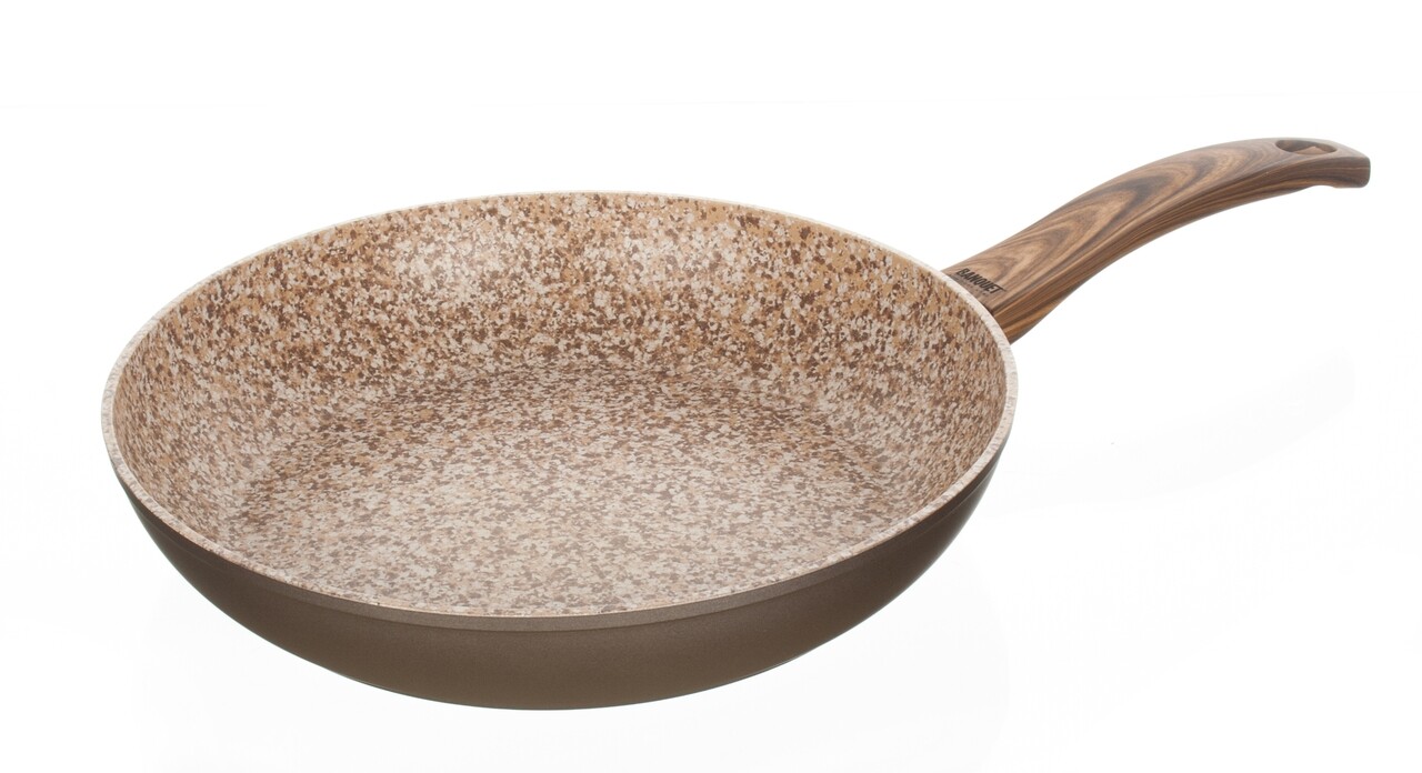 Kovácsolt alumínium serpenyő indukciós talppal, tapadásmentes felület folyami kőből, puha tapintású fogantyú fautánzattal.
