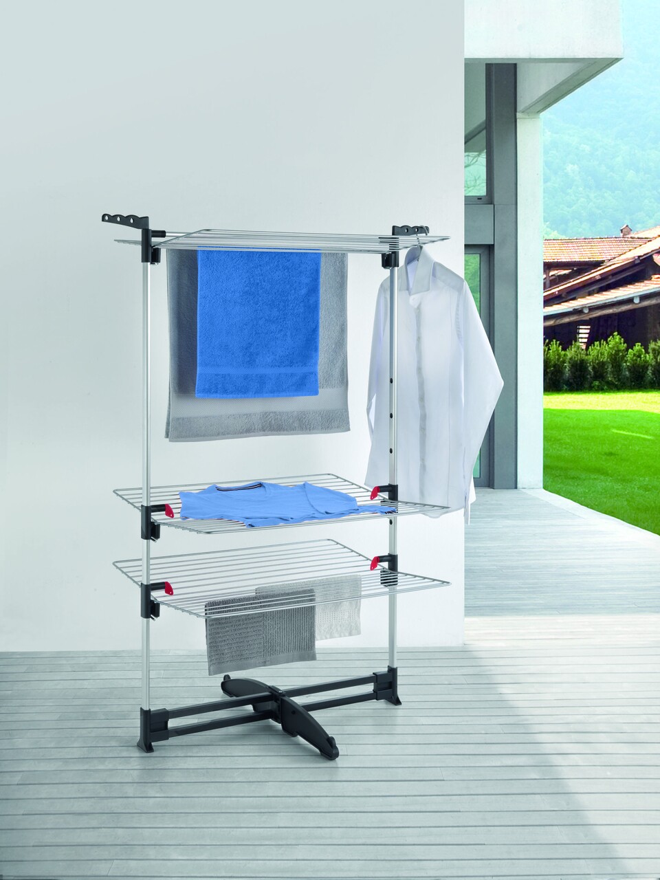 A Ciclone Vario függőleges összecsukható szárító 3 szinttel van ellátva (az alsó és a középső magasságban állítható) + fogas tartó.