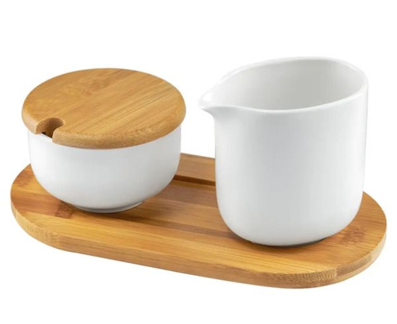 Set tava si 2 recipiente pentru zahar si lapte Natural, Ambition, 22x11x19 cm, portelan/bambus, alb