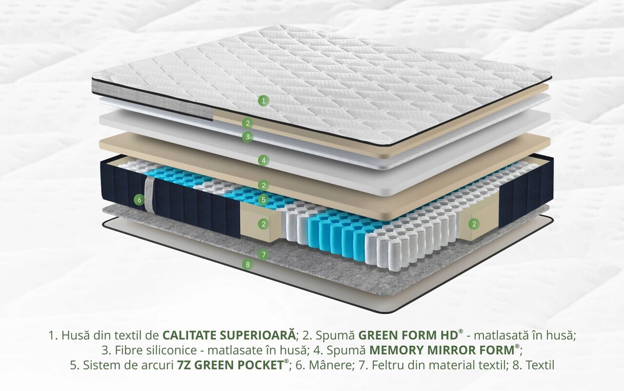 A Siena Pocket Memory 7 Comfort Zone matrac egyesíti a Green Form HD® stretch hab ortopédiai tulajdonságait a Memory Mirror Foam® hőtani tulajdonságaival és a 7Z Green Pocket® egyedileg tekert rugótechnológiájával.