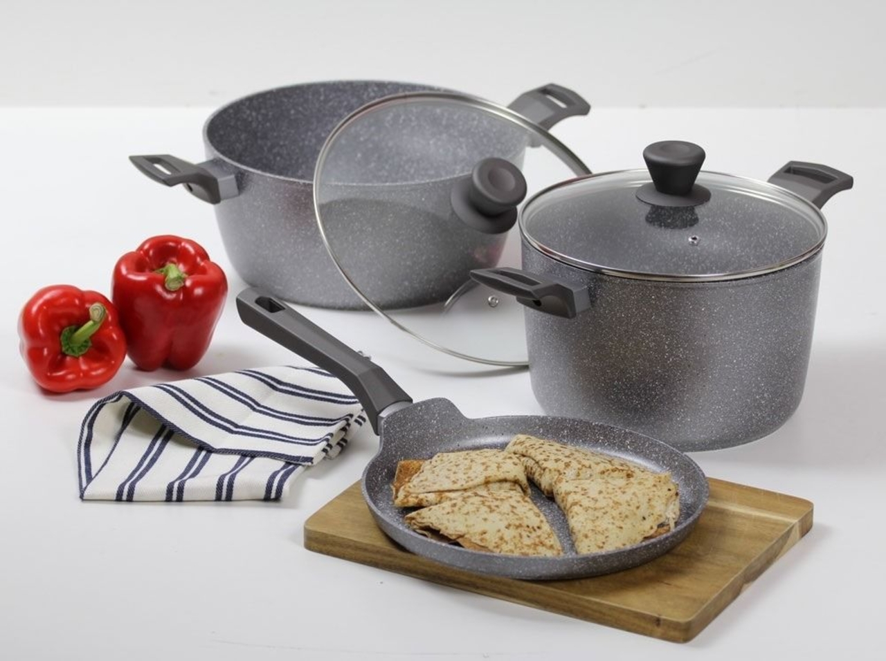 Alumínium serpenyő Qualum Basic Stone Edition bevonattal. A Silverstone serpenyők egyedi megjelenésűek, amelyek a követ utánozzák, a rusztikus és a modern kombinációját kínálják, miközben megőrzik az eleganciát semleges árnyalattal, bármilyen konyhában használhatók. Az alumínium hatékony hőátadást tesz lehetővé, ami sokkal gyorsabbá és ezáltal gazdaságosabbá teszi a főzést. A serpenyő belsejében lévő bevonat rendkívül ellenállóvá teszi a karcolásokkal szemben, a fogantyúk pedig puha tapintásúak és kényelmesek, így biztosítva a könnyű fogást. A serpenyők bármilyen típusú tűzhelyen használhatók, beleértve az indukciós tűzhelyet is.