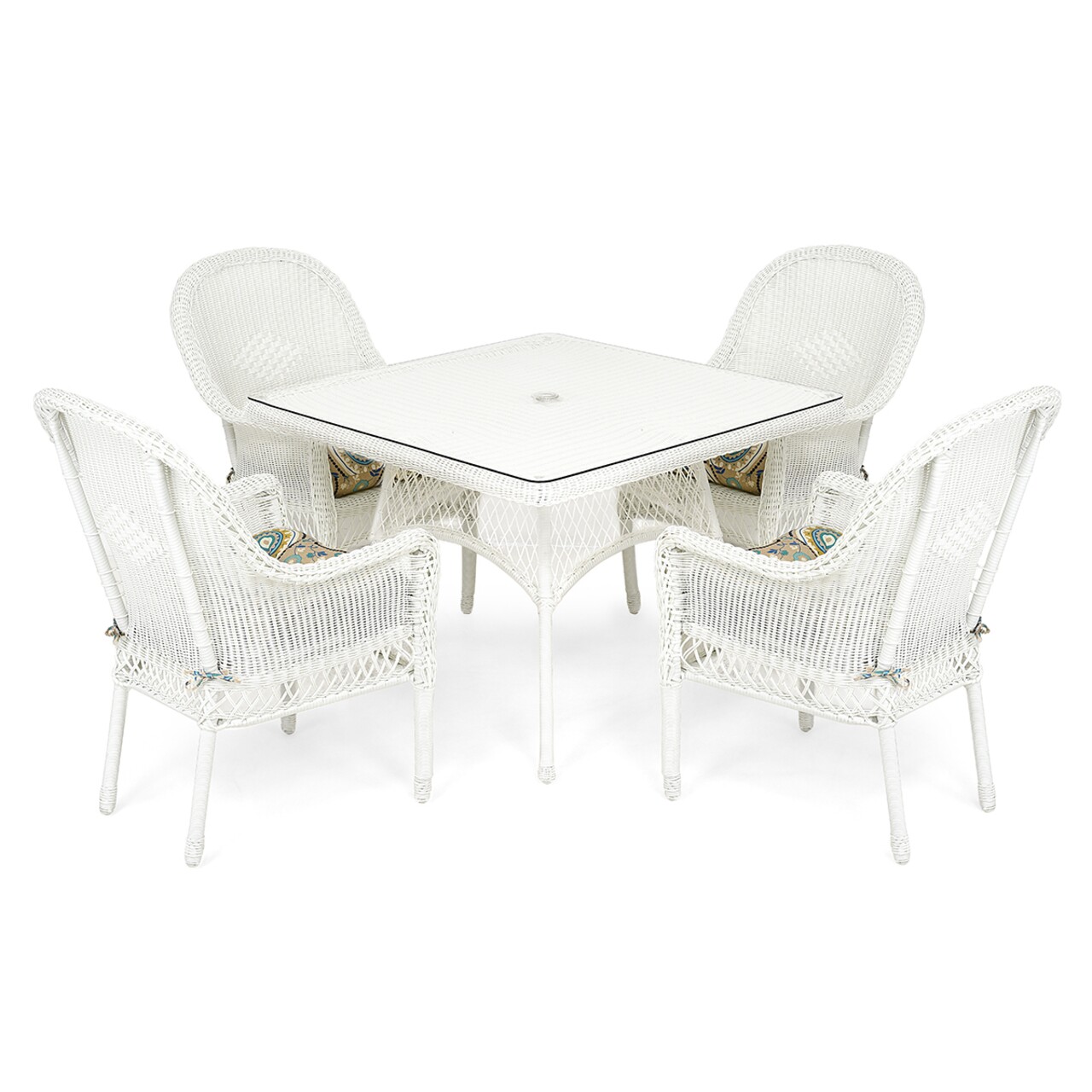 Méretek: Asztal: L.102 B.102 H.75 cm; 4 szék: L.55 l.58 H.96 cm.