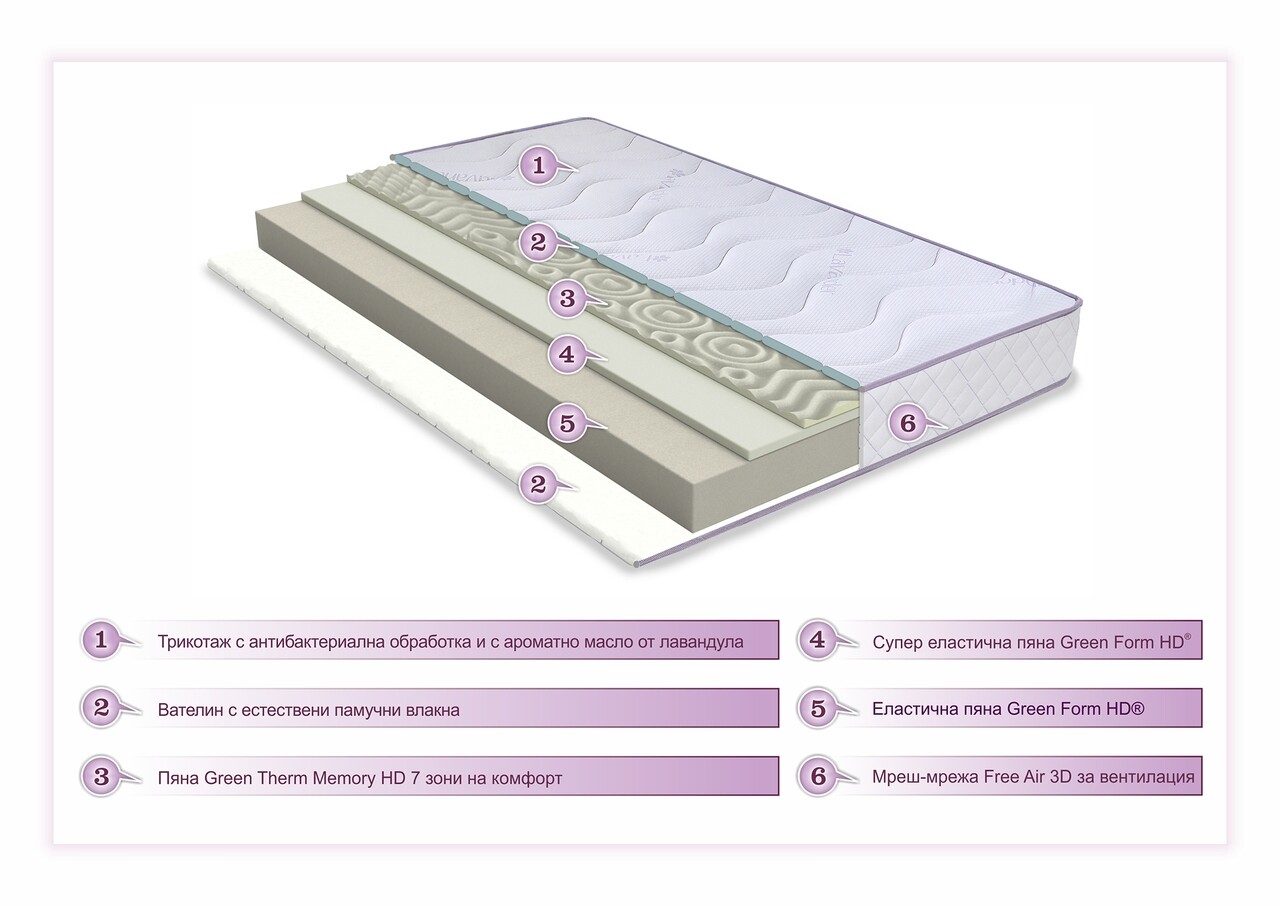 A szuper ortopédiai Tri Flexa levendula terápiás matrac, 12 + 3 + 3 Memory ötvözi a Green Form HD® rugalmas hab ortopédiai tulajdonságait a Green Therm Memory® hab kényelmével és a levendula illóolajok stresszoldó tulajdonságaival.