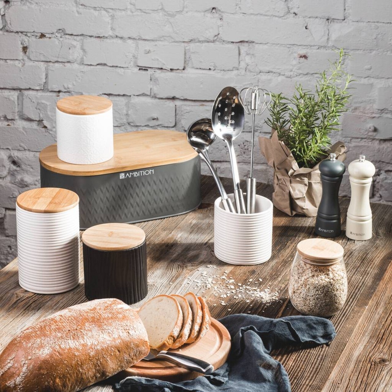 Új tárolódobozok sora, gyönyörű dombornyomott mintával. A tárolóedények dolomitból készülnek, bambusz fedelük természetes karaktert ad nekik. A tárolódobozok tökéletesen illeszkednek az aktuális trendekhez.