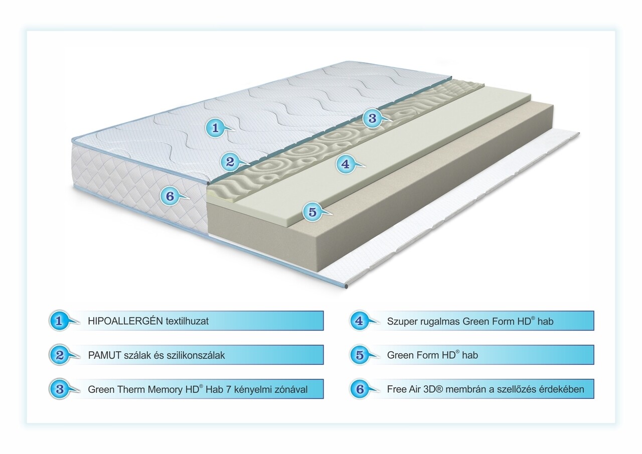 - 3 cm-es szuper elasztikus Green Form HD® hab, amely mini rugók közbenső rétegeként működik a test tartó és a memória alap között. Feladata, hogy javítsa a test támogatását az ágyéki, nyaki és térd területeken.