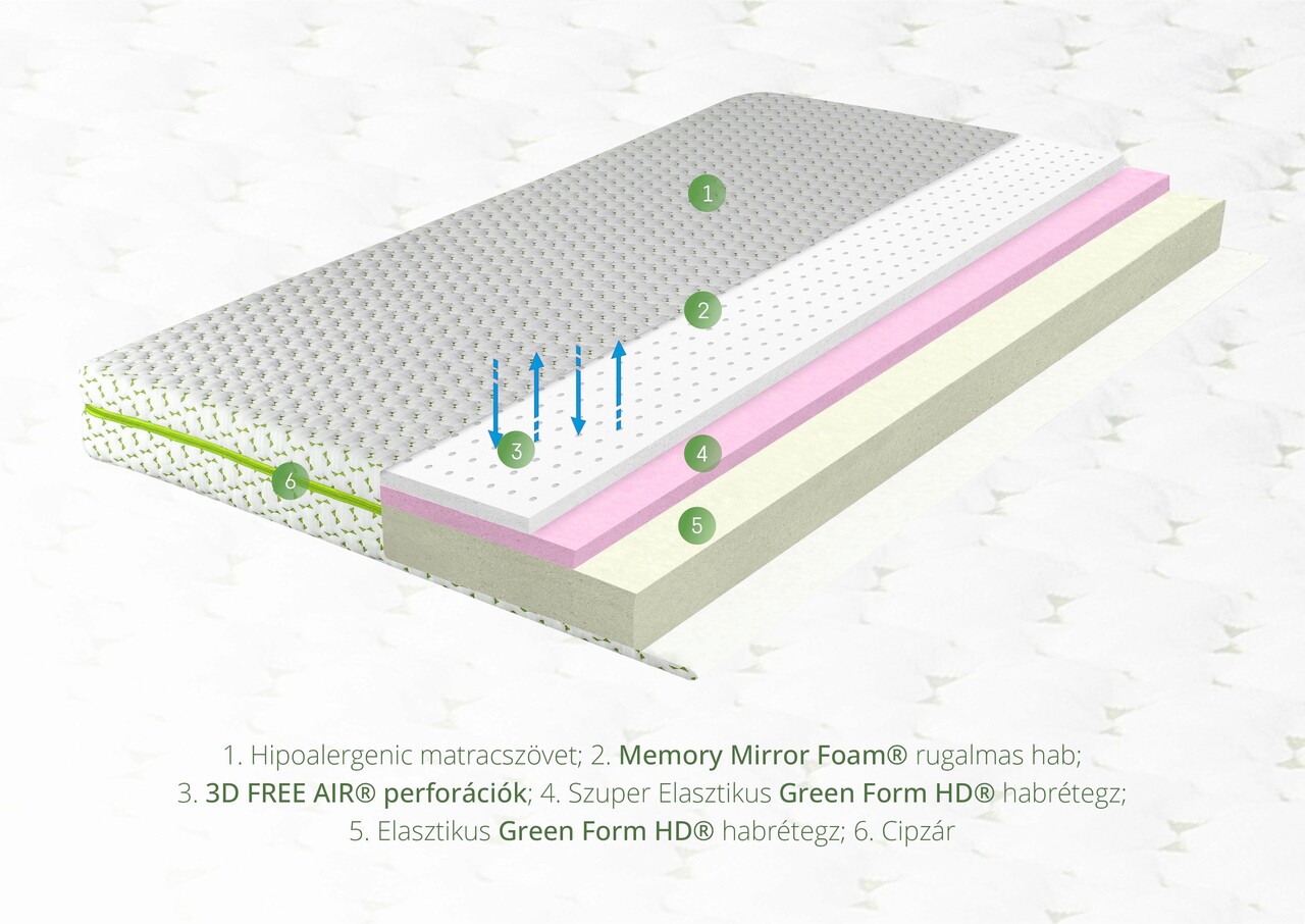- 3 cm szuperelasztikus Green Form HD® hab, amely mini rugók közbenső rétegeként működik a testtartó és a memóriaalap között. Feladata a test alátámasztásának javítása az ágyéki, a nyaki és a térd területén.