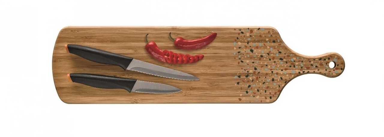 Vágódeszka és 2 kés, Terrazo, bambusz / rozsdamentes acél