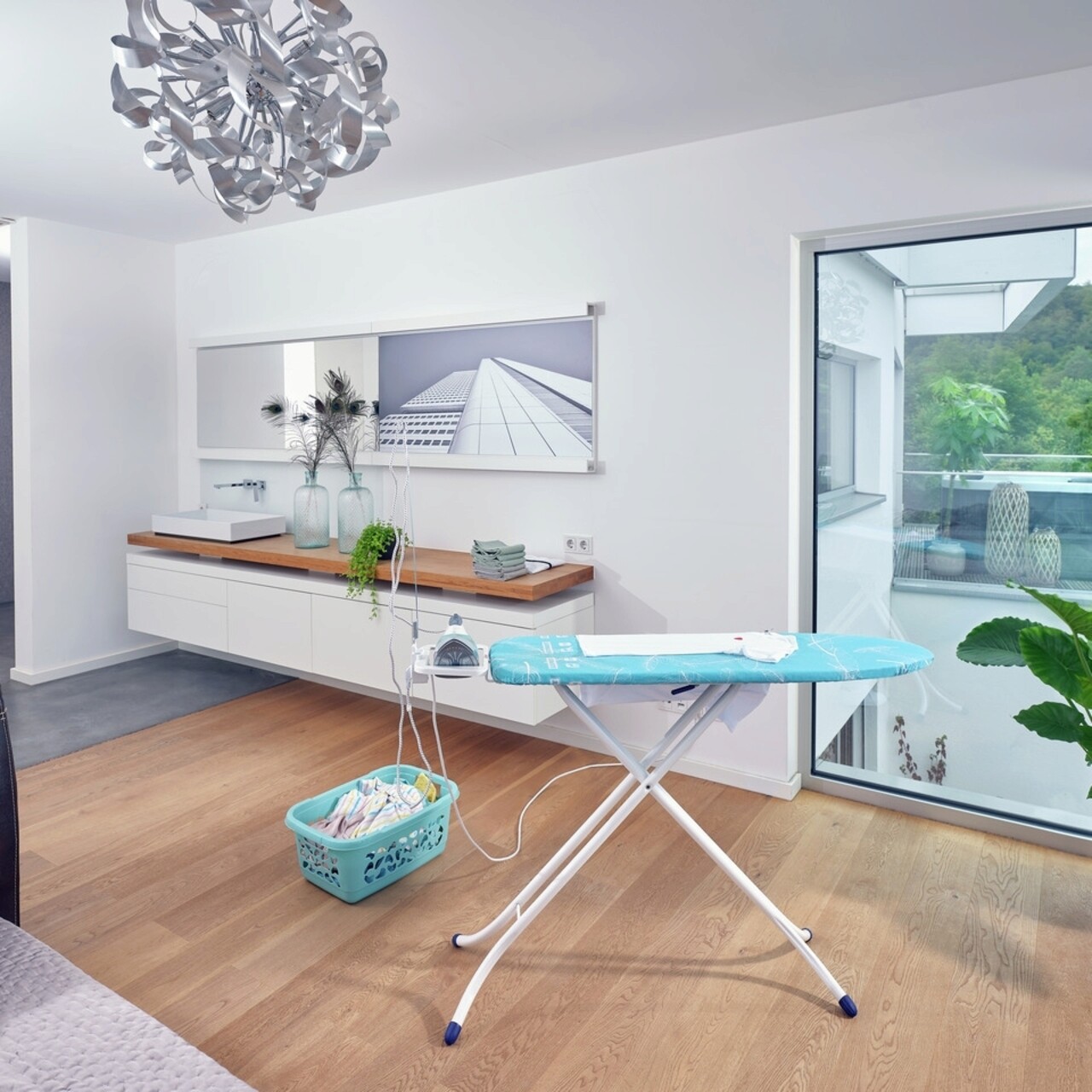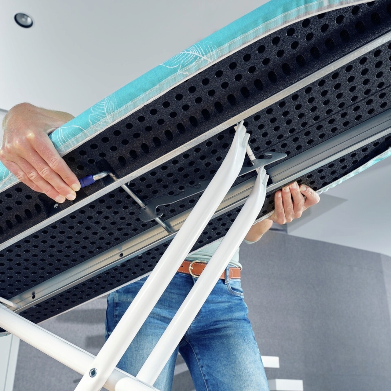 A Leifheit Air Board Compact Plus M vasalódeszka könnyebb, mint bármely más fém vasalódeszka, ugyanakkor rendkívül tartós. A "Thermo-Reflect" technológián alapul, tükrözi a vas által kibocsátott hőt és gőzt. Ennek a technológiának a segítségével a vasalási hatás két oldalon jön létre, a ruhák kiegyenesednek, felül és lent is, és a vasalás gyerekjátéknak tűnik.